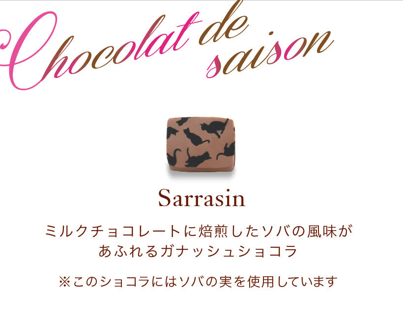 今年の新作ショコラは、焙煎したソバの風味があふれる「ショコラ・サラザン」。オレンジ色のボックスが印象的な定番のショコラアソートにこの新作のボンボンショコラを加えたアソートボックスがバレンタイン限定で登場します。